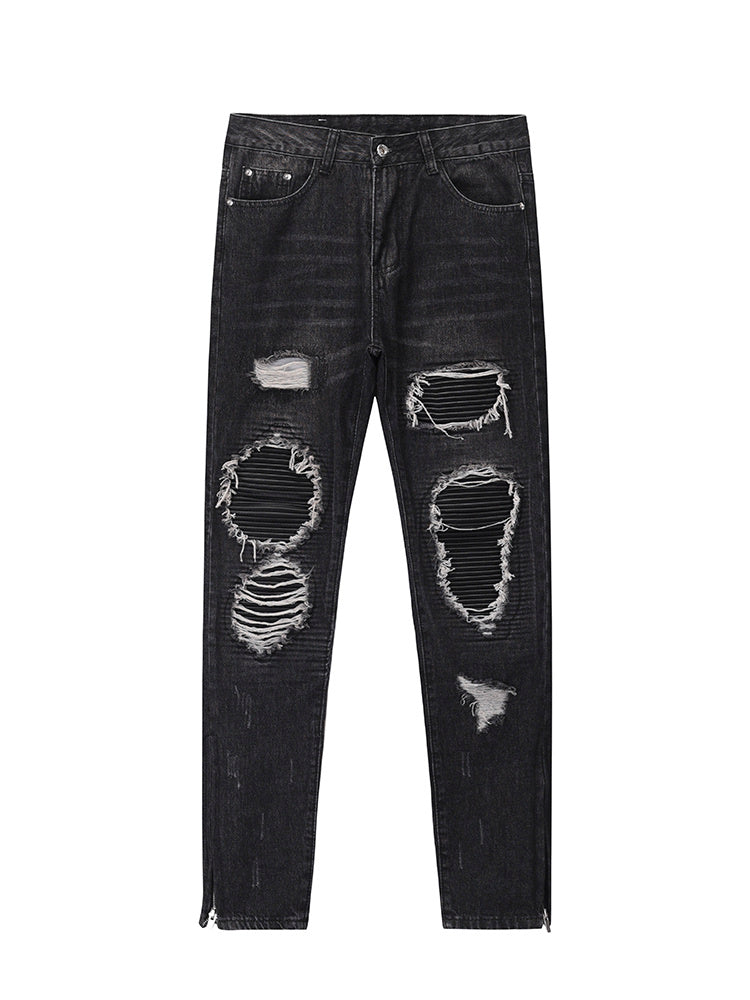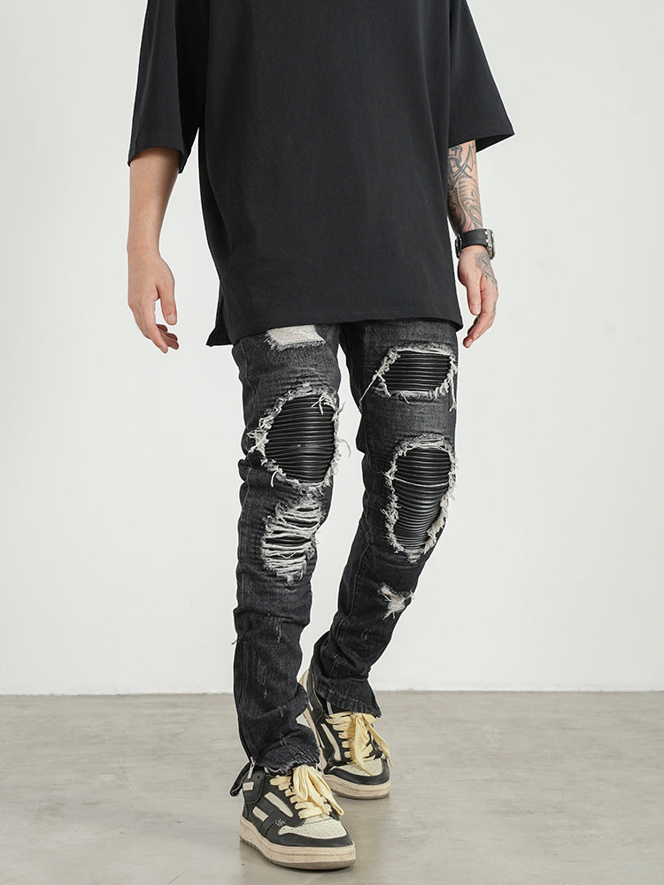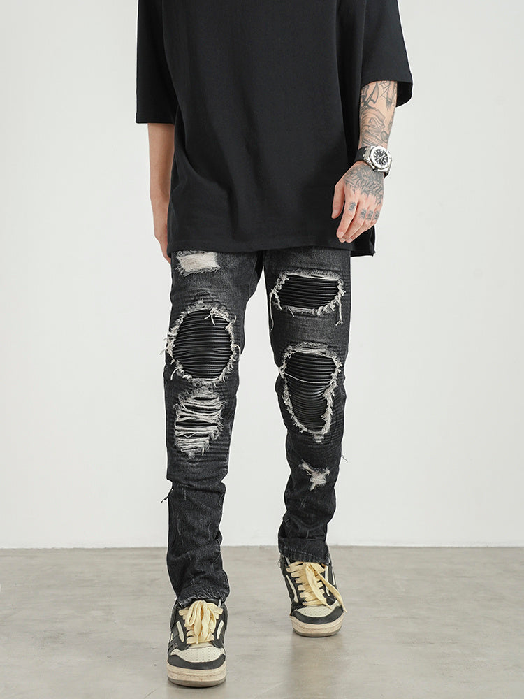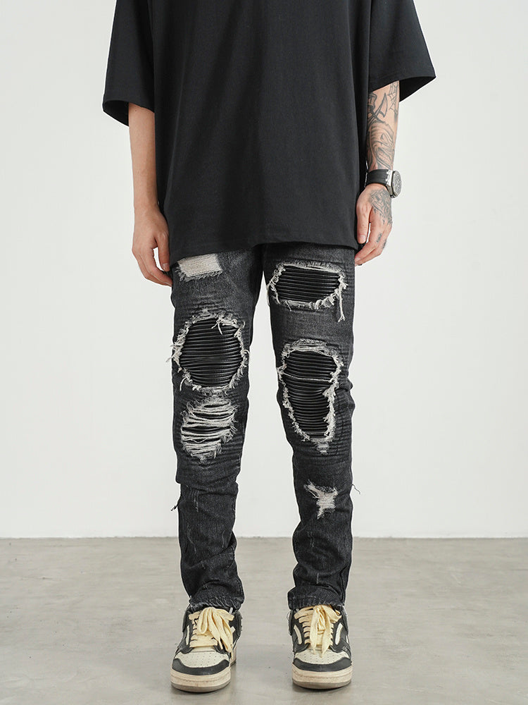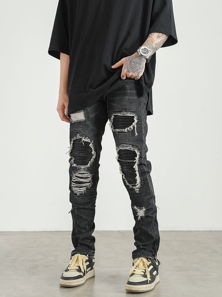 Men Ripped Patch PU And Leather Zipper Jeans